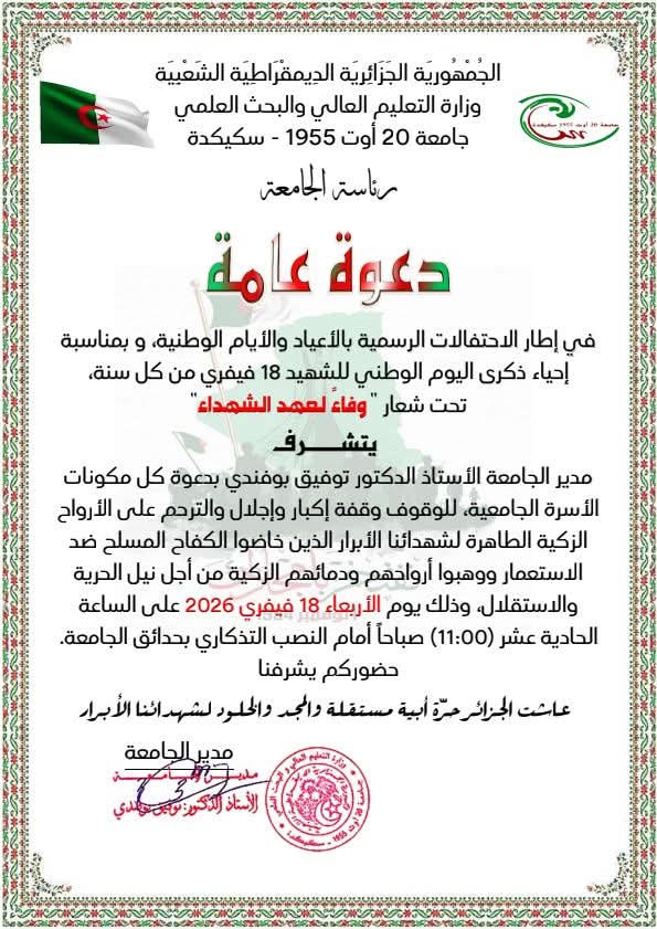 في إطار الاحتفالات الرسمية بالأعياد والأيام الوطنية، و بمناسبة إحياء ذكرى اليوم الوطني للشهيد 18 فيفري من كل سنة، تحت شعار " وفاء لعهد الشهداء" يتشرف مدير الجامعة الأستاذ الدكتور توفيق بوفندي بدعوة كل مكونات الأسرة الجامعية، للوقوف وقفة إكبار وإجلال والترحم على الأرواحالزكية الطاهرة لشهدائنا الأبرار الذين خاضوا الكفاح المسلح ضد الاستعمار ووهبوا أرواحهم ودمائهم الزكية من أجل نيل الحرية والاستقلال، وذلك يوم الأربعاء 18 فيفري 2026 على الساعة الحادية عشر (11:00) صباحاً أمام النصب التذكاري بحدائق الجامعة.