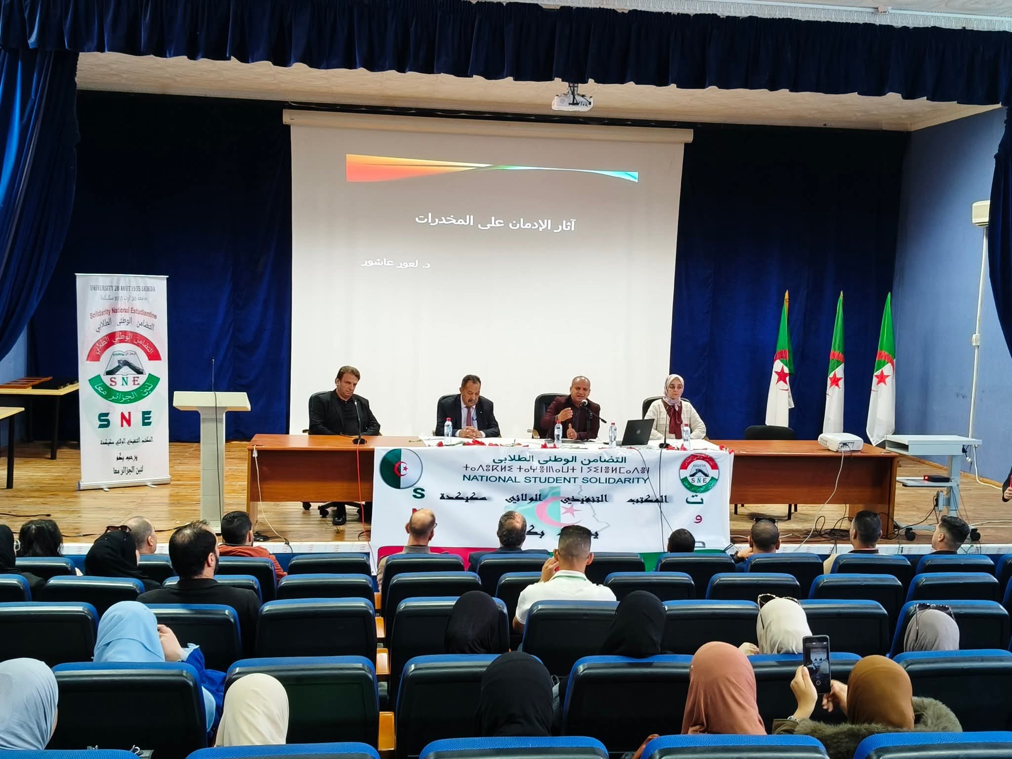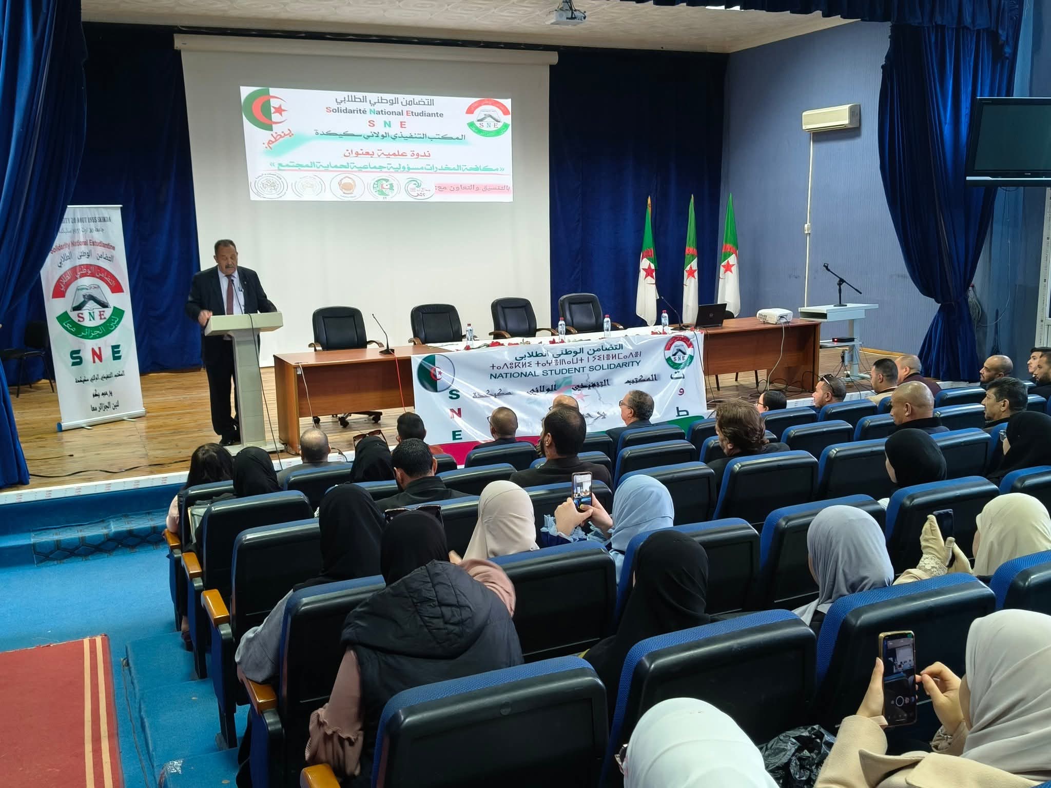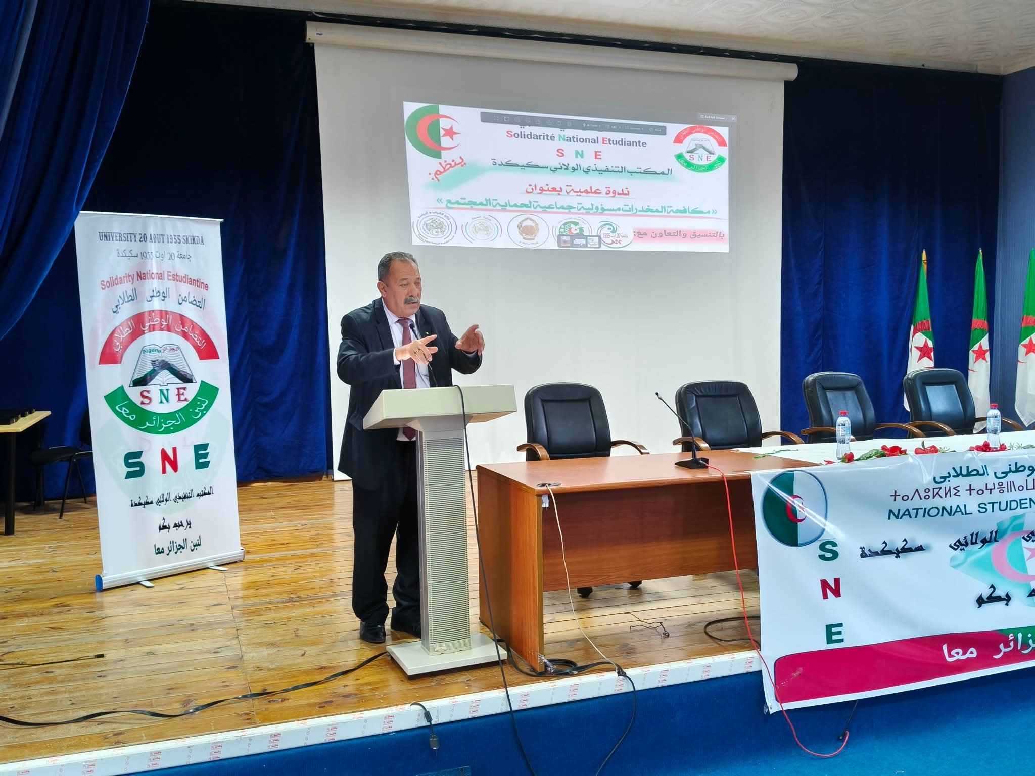 في إطار الحملات التحسيسية والتوعوية حول مخاطر الإدمان والمخدرات في الوسط الجامعي، نظم المكتب الولائي سكيكدة للتضامن الوطني الطلابي SNE Skikda ، صبيحة يوم الثلاثاء 18 نوفمبر 2025 على مستوى قاعة المحاضرات المكتبة المركزية، فعاليات الندوة العلمية التوعوية و التحسيسية حول مخاطر الادمان والمخدرات في الوسط الجامعي وطرق الوقاية منها وهذا بحضور كل من السيدات والسادة : مدير جامعة 20 أوت 1955 سكيكدة البروفيسور بوفندي توفيق ، ممثل عن مدير الخدمات الجامعية سكيكدة ، نائب المدير المكلف بالإستشراف والتوجيه ، ممثل عن مديرية الشباب والرياضة ، ممثلة عن مركز الوسط لمعالجة الإدماج سكيكدة ، ممثل عن مديرية المجاهدين ، مديرة المركب الرياضي الجواري مرج الذيب إطارات مديرية الخدمات الجامعية و مختلف فواعل المجتمع المدني وثلة من الأساتذة من مختلف التخصصات والطلبة المهتمين بالموضوع.