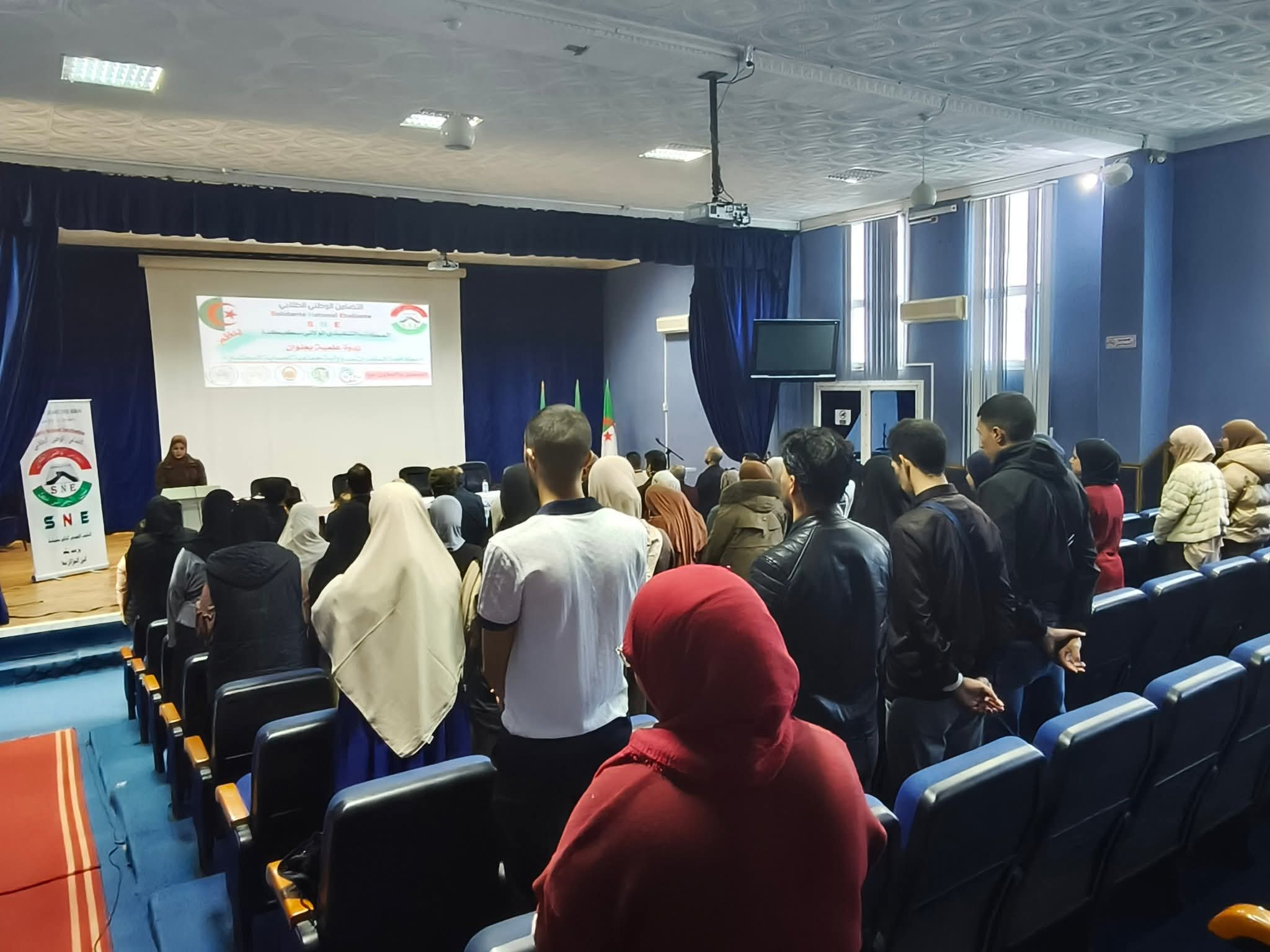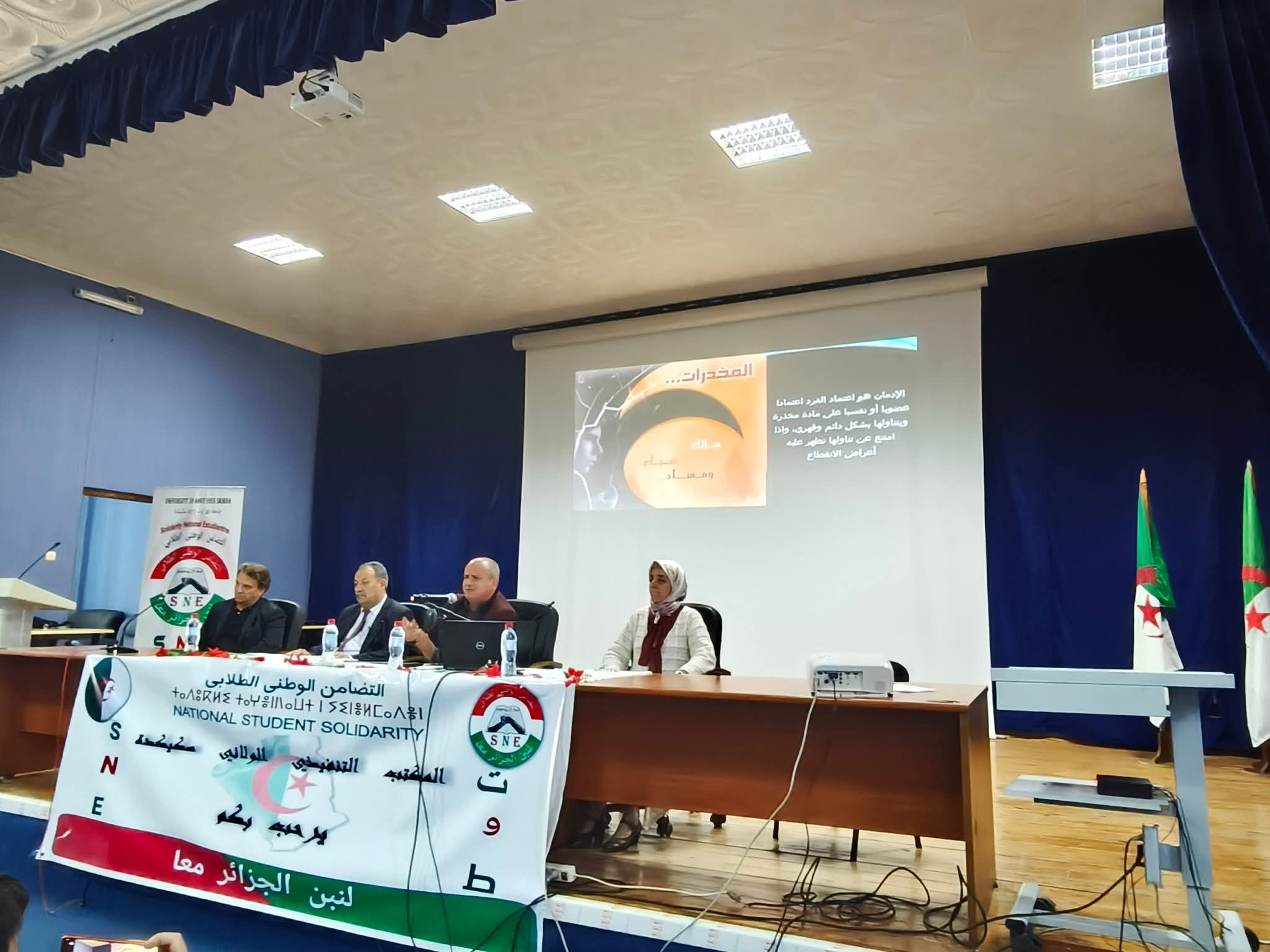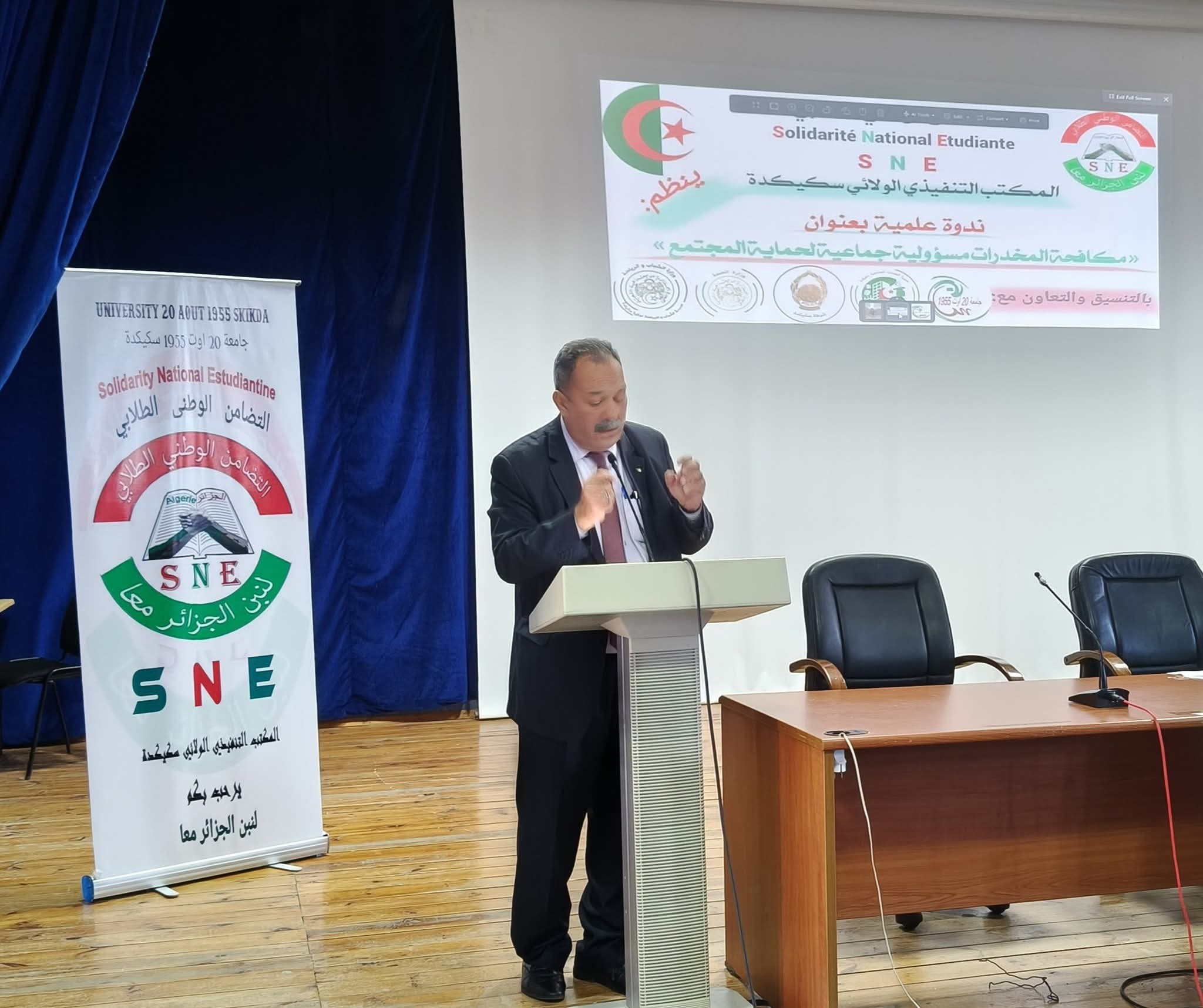في إطار الحملات التحسيسية والتوعوية حول مخاطر الإدمان والمخدرات في الوسط الجامعي، نظم المكتب الولائي سكيكدة للتضامن الوطني الطلابي SNE Skikda ، صبيحة يوم الثلاثاء 18 نوفمبر 2025 على مستوى قاعة المحاضرات المكتبة المركزية، فعاليات الندوة العلمية التوعوية و التحسيسية حول مخاطر الادمان والمخدرات في الوسط الجامعي وطرق الوقاية منها وهذا بحضور كل من السيدات والسادة : مدير جامعة 20 أوت 1955 سكيكدة البروفيسور بوفندي توفيق ، ممثل عن مدير الخدمات الجامعية سكيكدة ، نائب المدير المكلف بالإستشراف والتوجيه ، ممثل عن مديرية الشباب والرياضة ، ممثلة عن مركز الوسط لمعالجة الإدماج سكيكدة ، ممثل عن مديرية المجاهدين ، مديرة المركب الرياضي الجواري مرج الذيب إطارات مديرية الخدمات الجامعية و مختلف فواعل المجتمع المدني وثلة من الأساتذة من مختلف التخصصات والطلبة المهتمين بالموضوع.