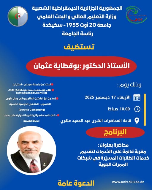 Dans le cadre de ses activités scientifiques, l'université 20 Août 1955 Skikda a le plaisir d'annoncer la tenue d'une conférence scientifique le Mercredi 17/12/2025 à 10h au niveau du centre des conférences Abdelhamid Mehri par le professeur Athmane BOUGUETTAYA de l'université de Sydney, Australie, dont l'intitulé est " A Service-based Approach to Drone Service Delivery in Skyway Networks".