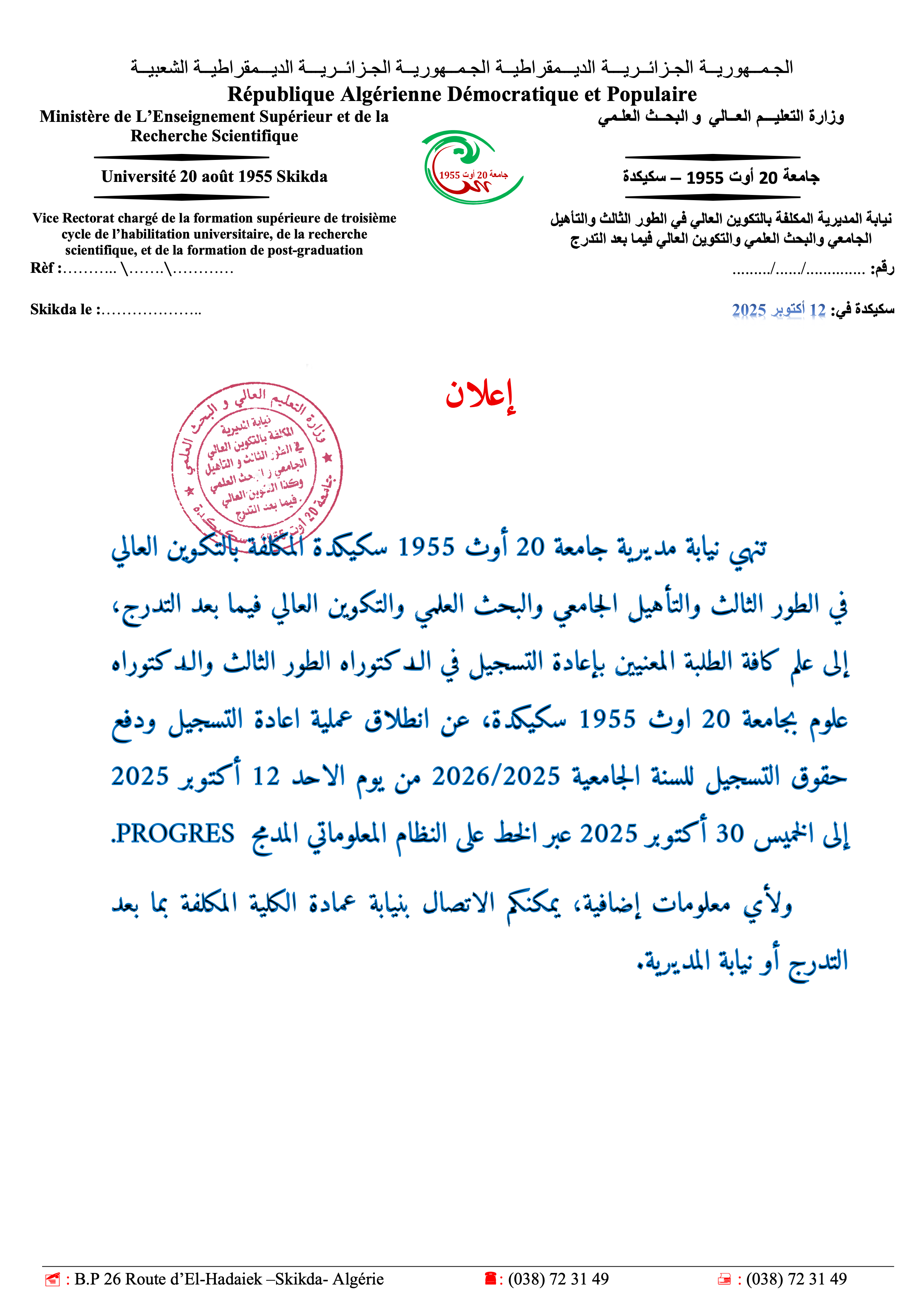 جامعة- سكيكدة ص ب 26 طريق الحدائق - سكيكدة . الجزائر 21000