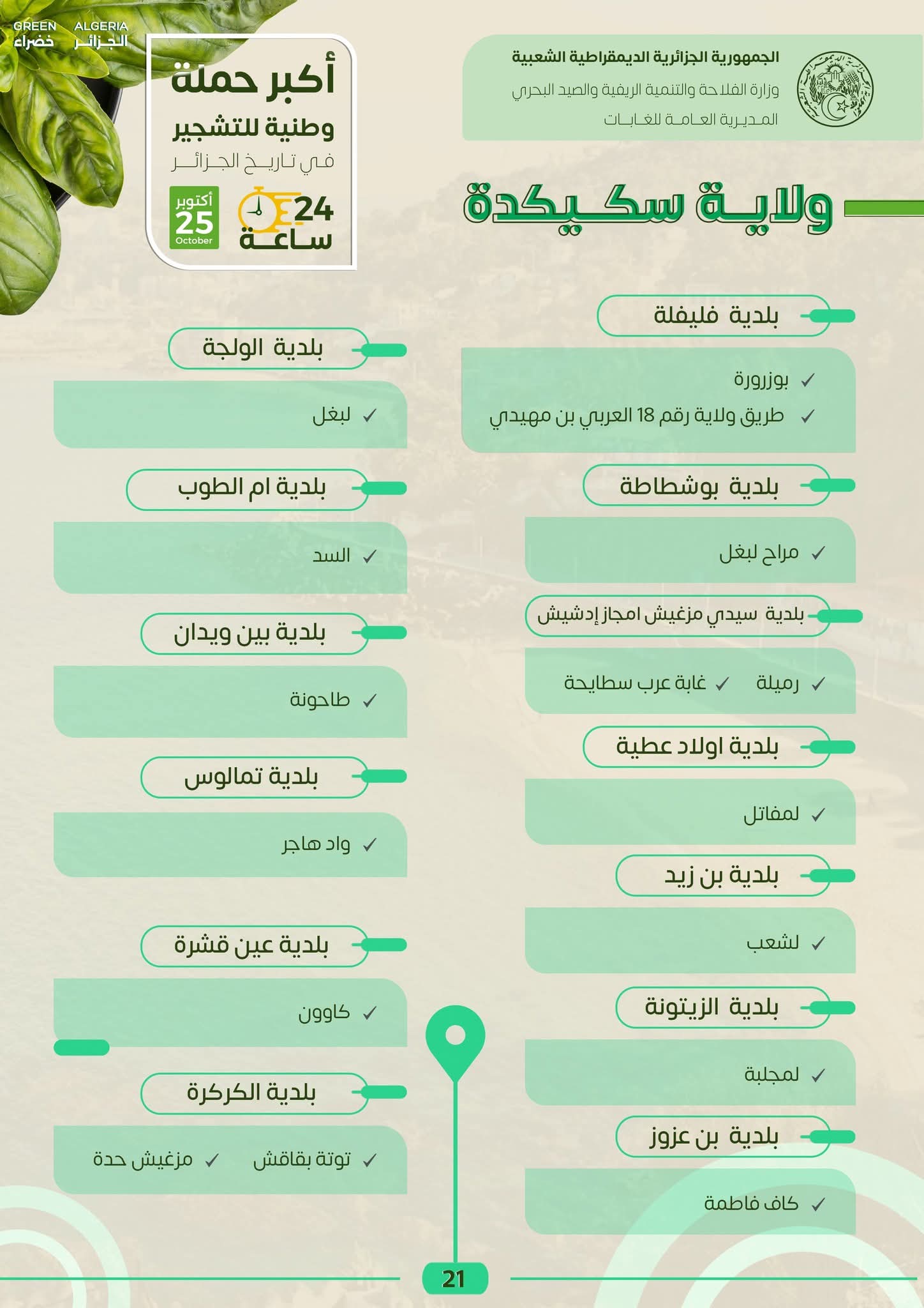 تنفيدا لتعليمات الوزارة الوصية ، وبمناسبة الاحتفال باليوم الوطني للشجرة الموافق لـ 25 أكتوبر 2025 ، والمتزامن مع الحملة الوطنية الكبرى لغرس مليون شجرة تحت شعار : " خضراء بإذن الله " وعلى إثر الحملة التي تنظمها ولاية سكيكدة يتشرف السيد مدير الجامعة البرفيسور بوفندي توفيق بدعوة كافة أفراد الأسرة الجامعية من (طلبة، أساتذة ، موظفين، نقابات ، تنظيمات طلابية ، نوادي علمية) ، للمشاركة الفعلية في هذه المبادرة الوطنية ، والمساهمة في غرس الأمل والحياة من أجل جزائر خضراء ومستدامة وهذا يوم السبت 25 أكتوبر 2025 ، وتسهيلاً لمشاركتكم قامت الولاية بتوفير حافلات للنقل ( مجانا ) ذهاباً واياباً ابتداء من الساعة 07:30 صباحاً الإنطلاق من ساحة الشهداء امام قاعة عيسات إيدير عبر الموقعين :